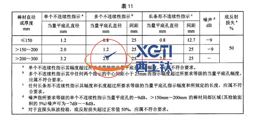 3.6.2 B類用途的TA15鈦合金棒材,應(yīng)按本規(guī)范的附錄A進(jìn)行徑向縱波、周向橫波檢驗(yàn)。徑向縱波檢驗(yàn)允許的缺陷當(dāng)量值見(jiàn)表11,周向橫波檢驗(yàn)不允許存在任何超過(guò)人工傷反射幅度的信號(hào)。